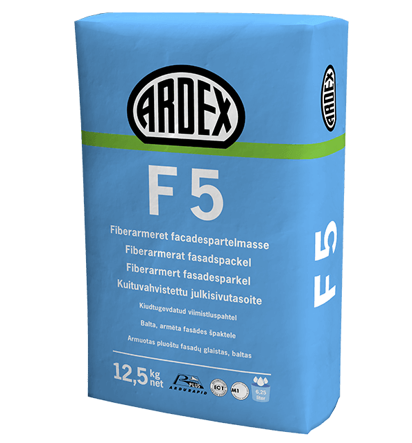 Veggsparkel Fiberarmert fasadesparkelmasse ARDEX F 5 Til oppretting, utbedring og sparkling av fasader samt vegg- og takflater Økt sikkerhet gjennom fiberforsterkning Herder og tørker hurtig uten sprekker, selv i tykke lag.