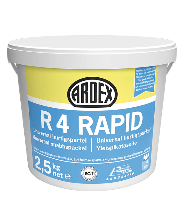 ARDEX R4 RAPID kan brukes uten priming på alle faste overflater av betong, sement- og anhydritpuss, gipsplater, fibergips, sponplater og OSB-plater, trebaserte underlag, keramiske fliser, naturstein, terrazzo, vaskbare emulsjonsmalinger, lateksmalinger, akrylmalinger, alkydmalinger og glasfibervev. Til fylling av hulrom, hull og sprekker. Sparkling av skjøter, fuger og til festing av hjørneprofiler, samt til finsparkling i én arbeidsoperasjon.