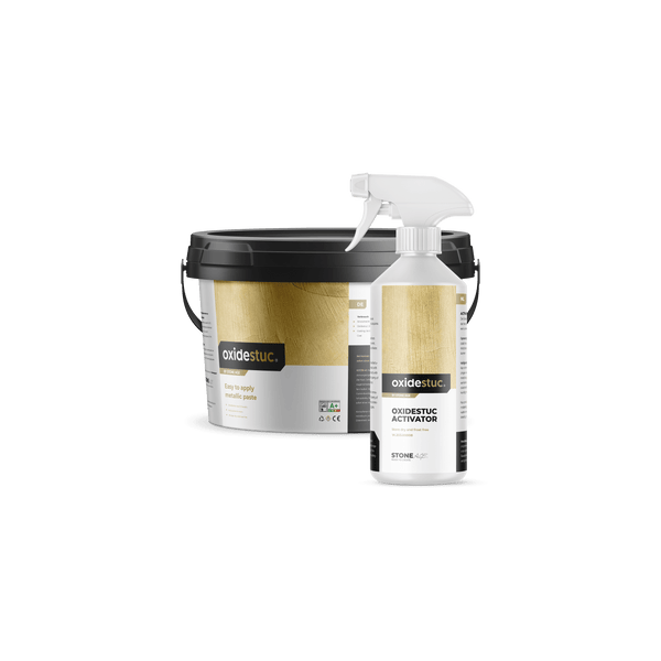 Oxidestuc er en metallisk beton-finish, der er nem at anvende på vægge, møbler, hylder og bordplader og giver fladerne en let metallisk glans.Oxidestuc er klar til brug, en let-anvendelig puds til vægge, møbler, hylder og bordplader indendørs. Det fås i seks unikke udgaver: sølv, guld, bronze, kobber, aluminium, rust og stål.